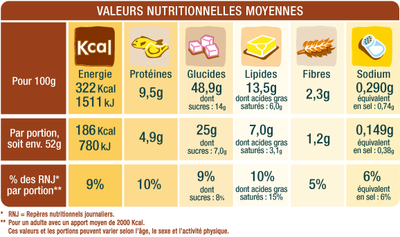 - Ổ lớn : Bột lúa mì 51%, nước, trứng gà 12,2%, dầu hạt cải dầu, đường, xi-rô glucose, fructose, đường ngọt 2,3% (đường, chất béo thực vật: shea, hương vị), chất nhũ hóa: mono và diglycerides của axit béo, hương vị hoa cúc, chiết xuất thực vật tạo màu (bột nghệ, ớt bột), muối, men, bột của lúa mạch mạch nha, chất xơ lúa mì , gluten lúa mì , chất chống oxy hóa: acid ascorbic
