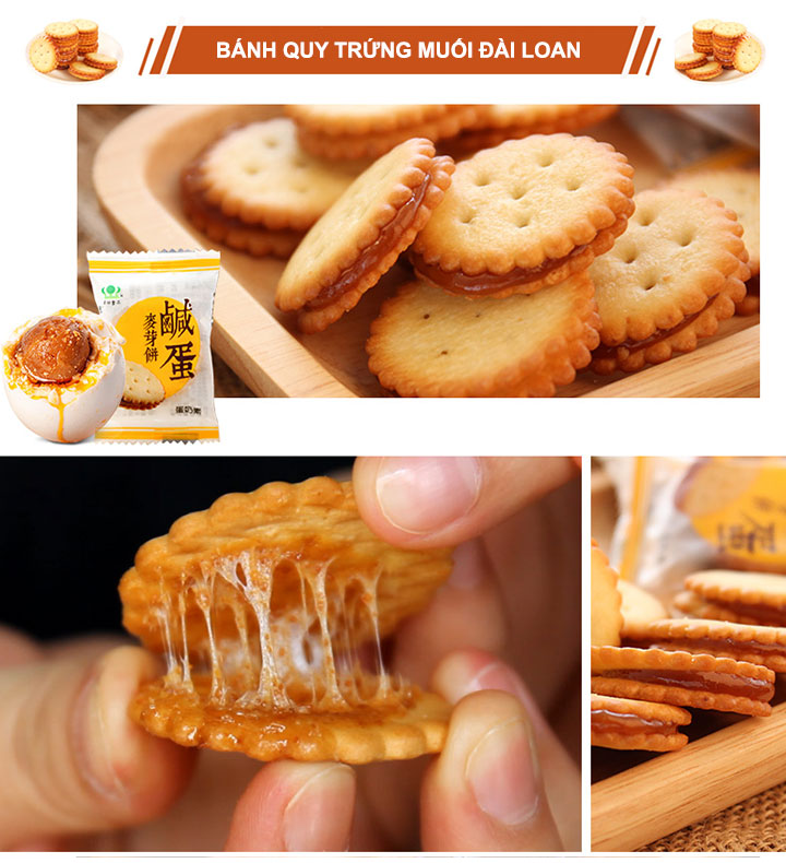 Bánh quy trứng muối Đài Loan với vị mặn mặn, giòn giòn của lớp vỏ bánh thơm ngon, bên trong là loại kem mạch nha có vị trứng muối lạ miệng, hấp dẫn người sử dụng ngay từ những miếng ăn đầu tiên, ăn bao nghiện luôn ạ…