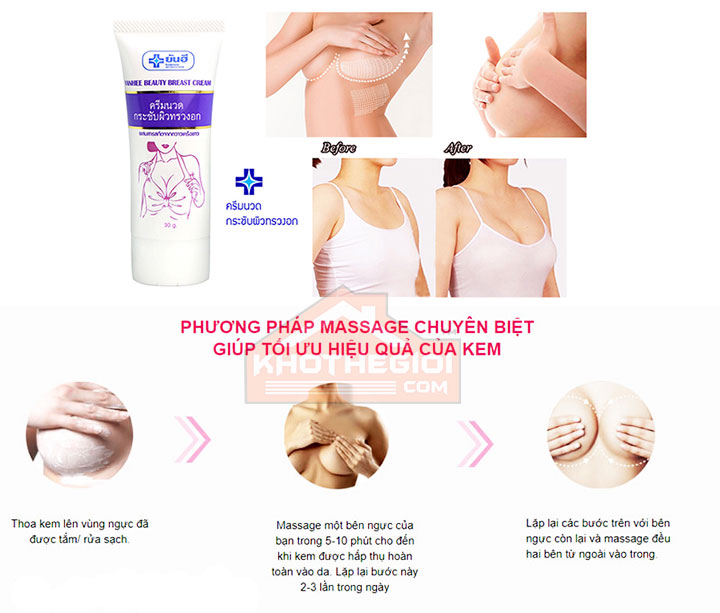 - Thoa kem vào mỗi bên ngực, sau đó dùng tay massage ngực theo chuyển động tròn trong vòng 3 đến 5 phút mỗi sáng và tối. Ngày dùng 2 lần.